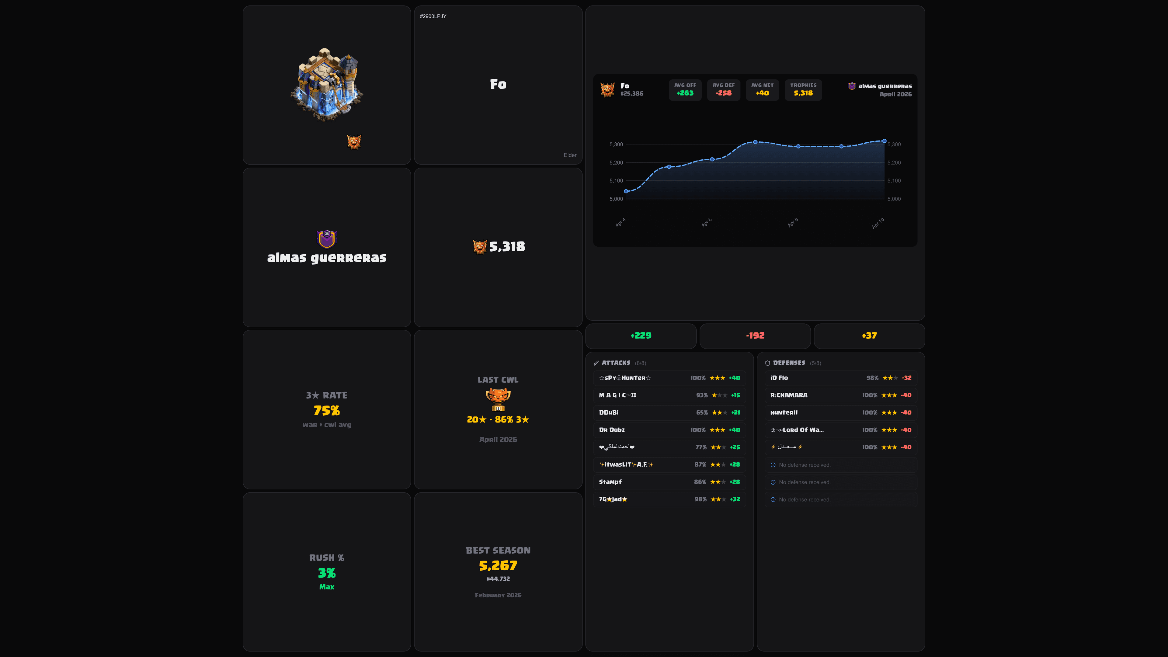 Spieler-Tag eingeben, um Profil, Legende-Stats, War-Verlauf und mehr zu sehen.